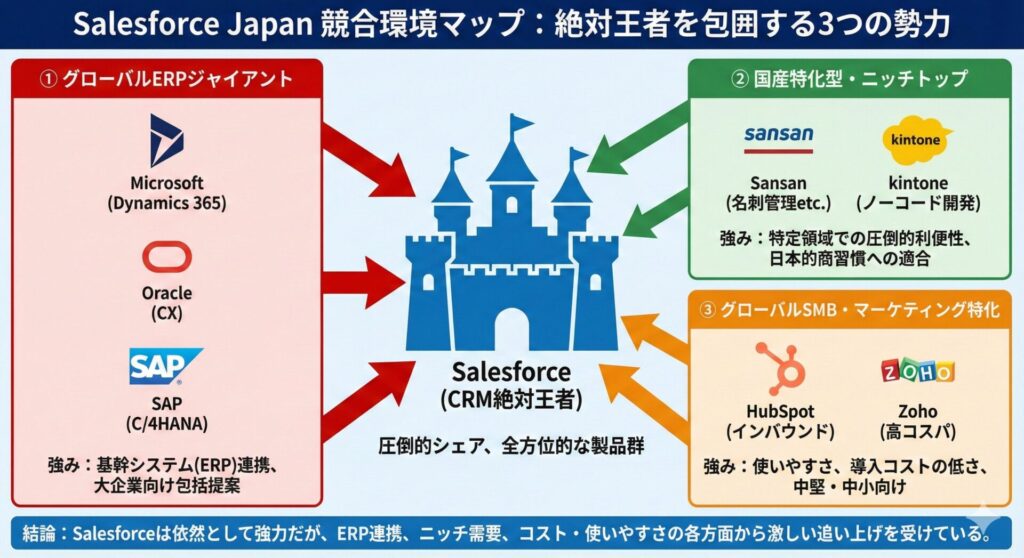 Microsoft・SAP・HubSpot・Zoho・国産SFAなど、競合は多い。 - 強みは「Customer 360プラットフォーム」「エコシステム」「AI・データ投資」。