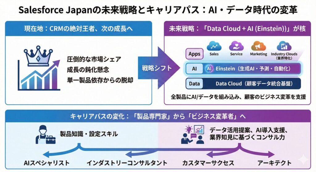 - 主要プロダクト群:Sales Cloud、Service Cloud、Marketing Cloud、Commerce Cloud、Platform、Data Cloud、AI(Einstein/Agentforce)など